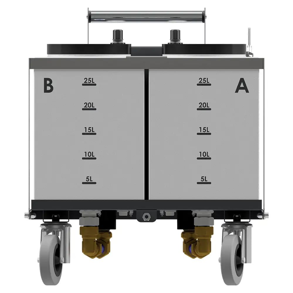 The machine includes 2 x 25 litre material tanks, and double acting positive displacement pumps.