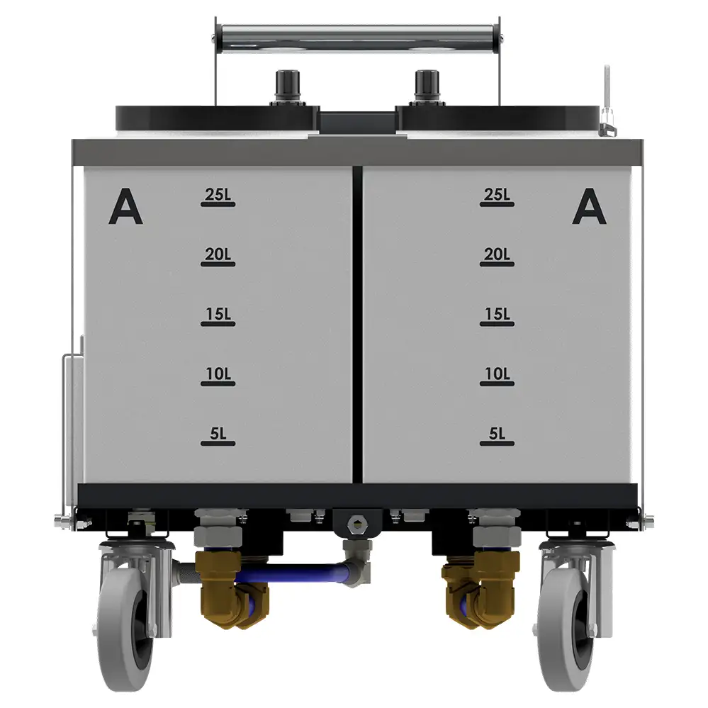 The machine includes 2 x 25 litre material tanks and double acting positive displacement pumps for a robust and effortless operation.